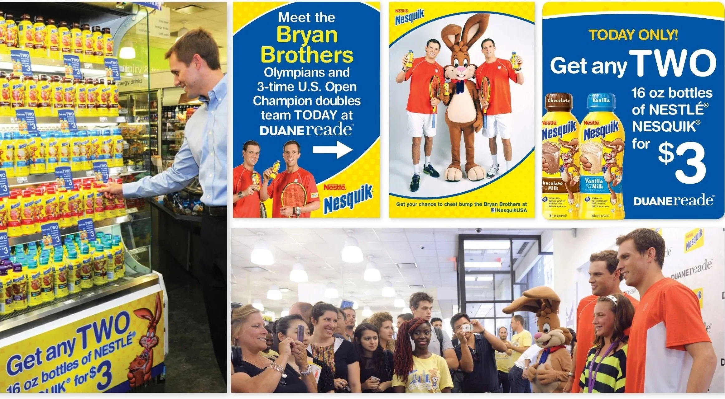 I designed print and event marketing materials for a Duane Reade × Nestlé activation, supporting Nesquik-branded promotions and live appearances by tennis champions Bob and Mike Bryan. The work focused on high-visibility retail environments and clear, on-brand communication for a broad public audience.