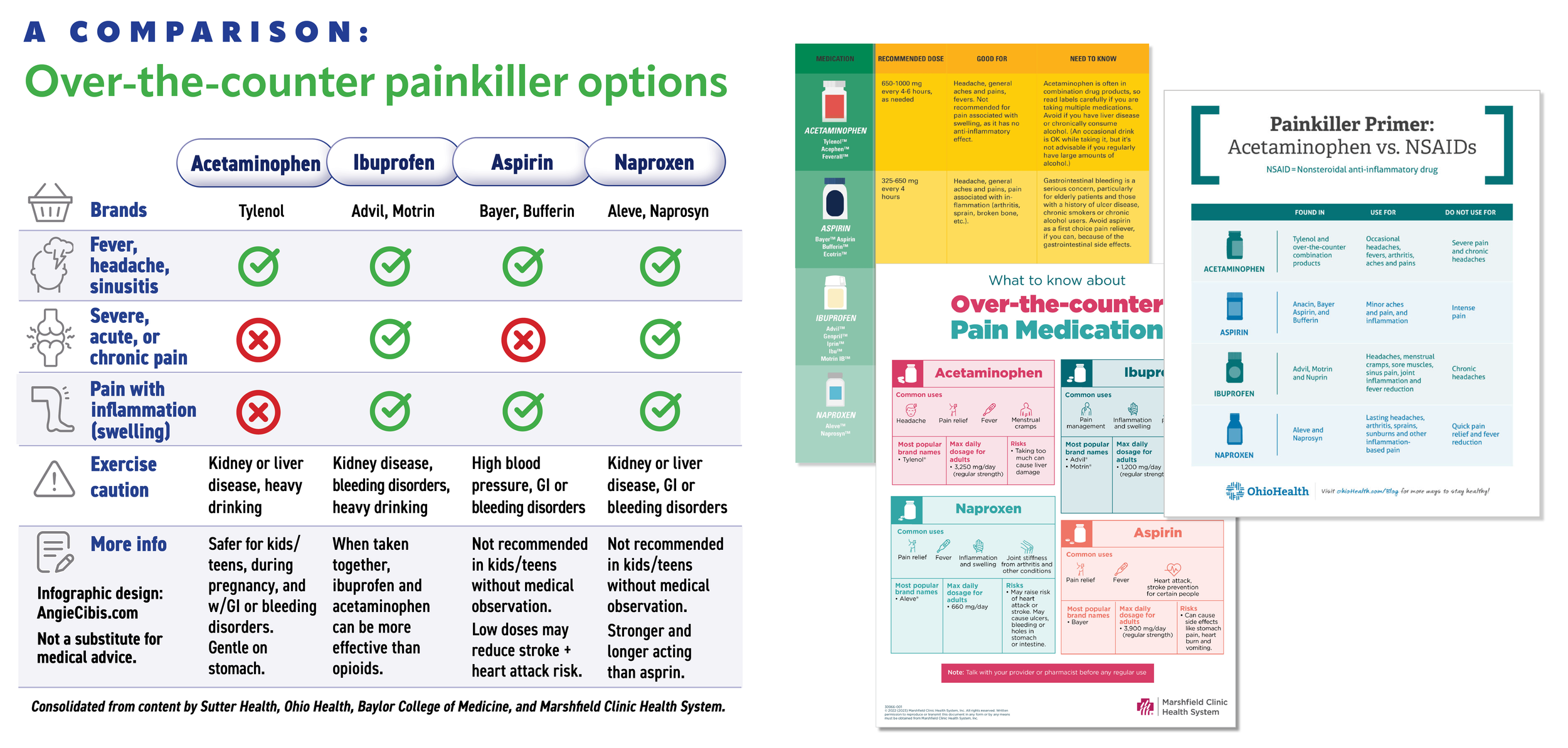 Comparison chart of over-the-counter painkillers including Acetaminophen, Ibuprofen, Aspirin, and Naproxen with information on brands, uses, side effects, cautions, and additional notes.