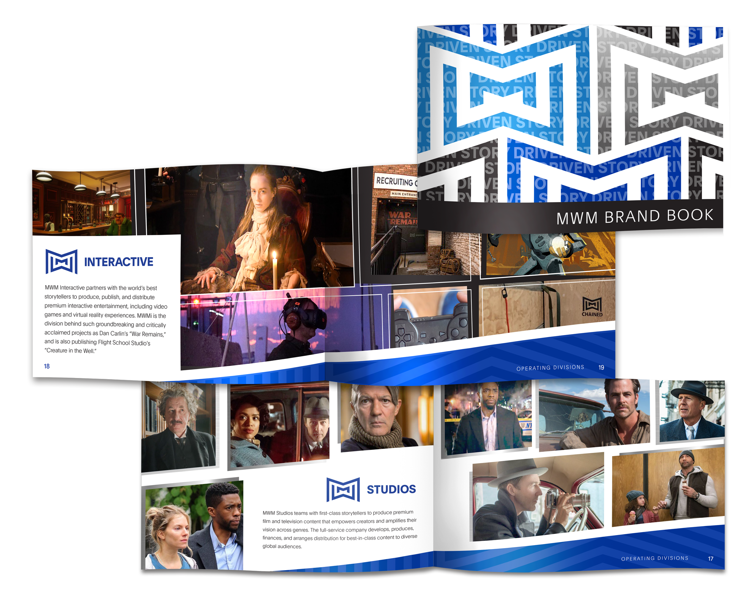I designed this print brand book for MWM to showcase its high-profile film, television, interactive, and theatrical work through cinematic imagery and a bold, modular layout. The dynamic structure highlights the breadth and credibility of MWM’s portfolio while reinforcing its identity as a premium, story-driven production company.